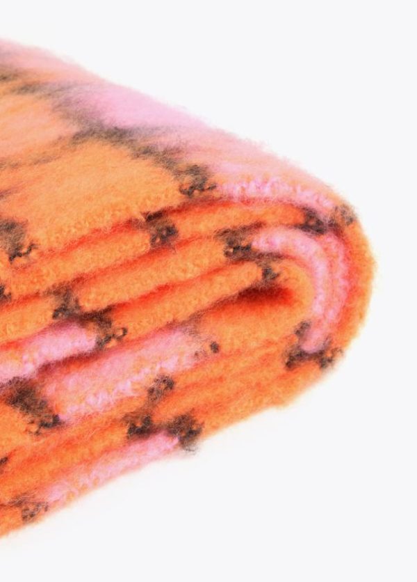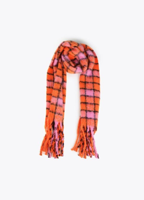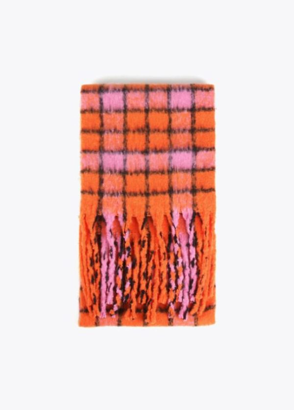 Bufanda de cuadros en diferentes colores combinados y logo grabado sobre efecto piel.
