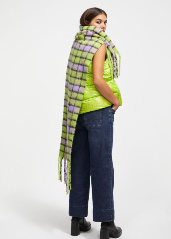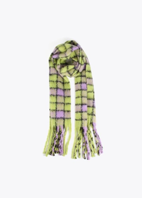 Bufanda de cuadros en diferentes colores combinados y logo grabado sobre efecto piel.