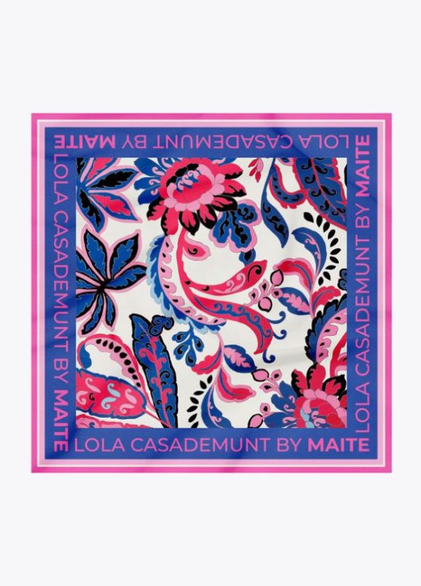 Pañuelo satinado con estampado floral y logotipado en tonos azules y rosas.