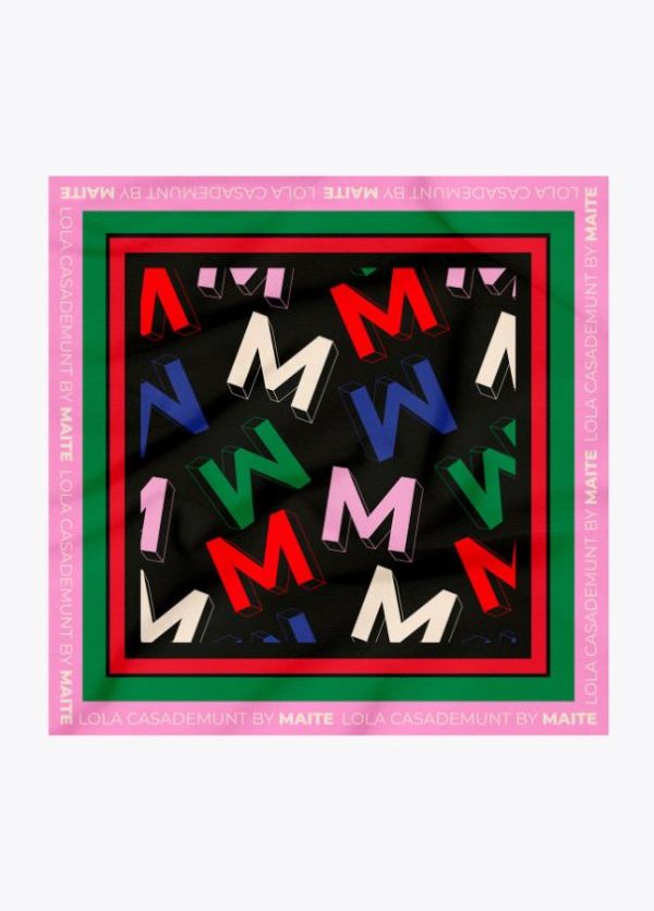 Pañuelo satinado con letras logo multicolor en parte central sobre fondo negro.