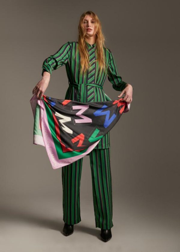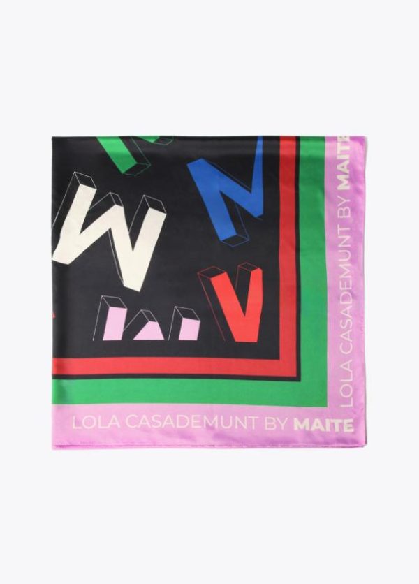 Pañuelo satinado con letras logo multicolor en parte central sobre fondo negro.