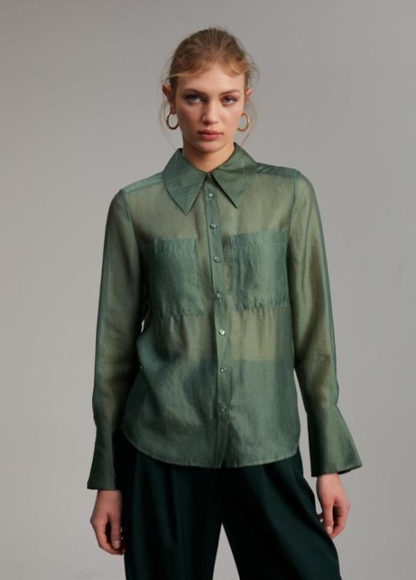 Blusa efecto organza con transparencia. Cuello y puños camiseros. Bolsillos plastrón en frontal. Cerrada con motones a tono-