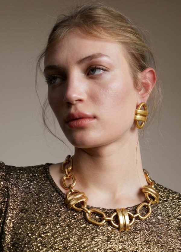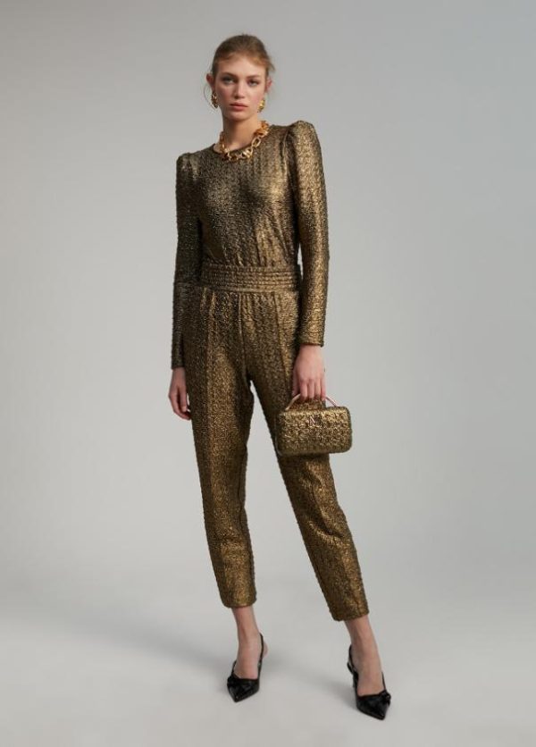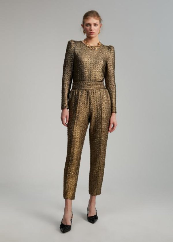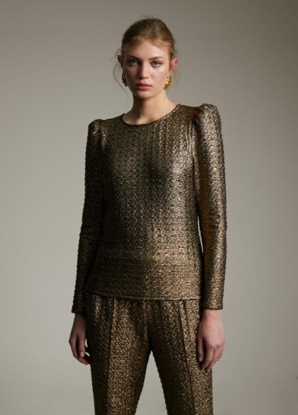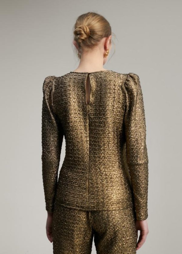 Blusa dorada de cuello redondo. Manga larga con hombreras de efecto abullonado. Detalle de apertura en espalda y confección en tejido de fantasía.