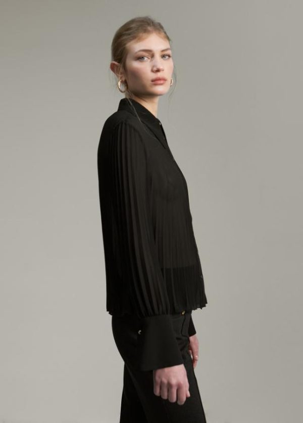 Blusa fluida con cuello y puños camiseros. Detalle botones joya en puño y cuello. Cerrada con botones centrales a tono.