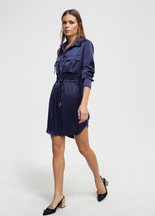 Blusón satinado con cuello y puños camiseros. Abierto con botones bajo tapete hasta cintura. Bolsillos plastrón con tapete y hebilla metálica. Cintura ajustable.