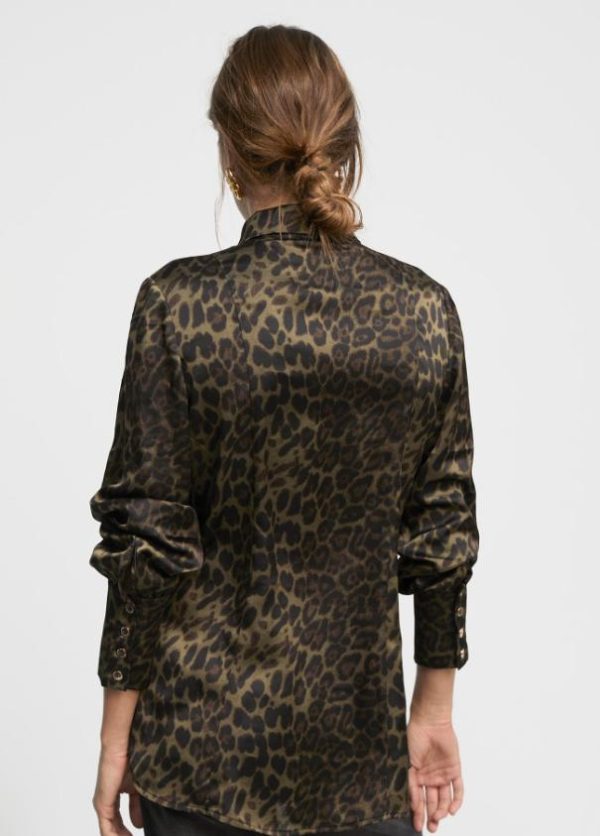Camisa en estampado animal print. Cuello y puños camiseros. Cierre con botones bajo tapete.
