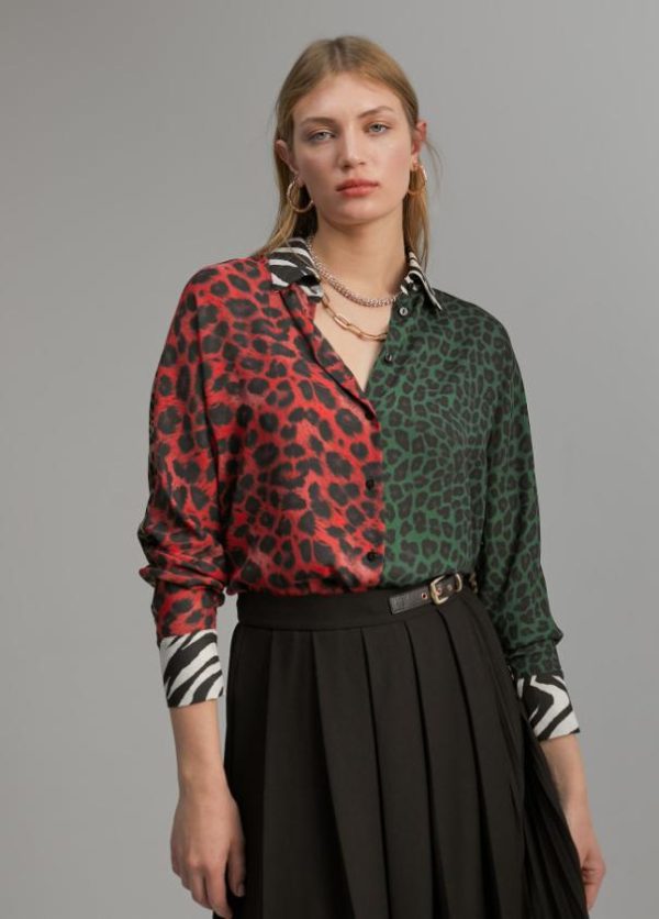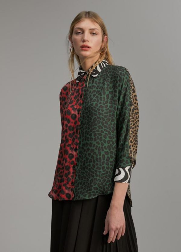 Camisa estampada en animal print tricolor. Cuello y puños contrastados en cebra bicolor. Cerrada con botones.