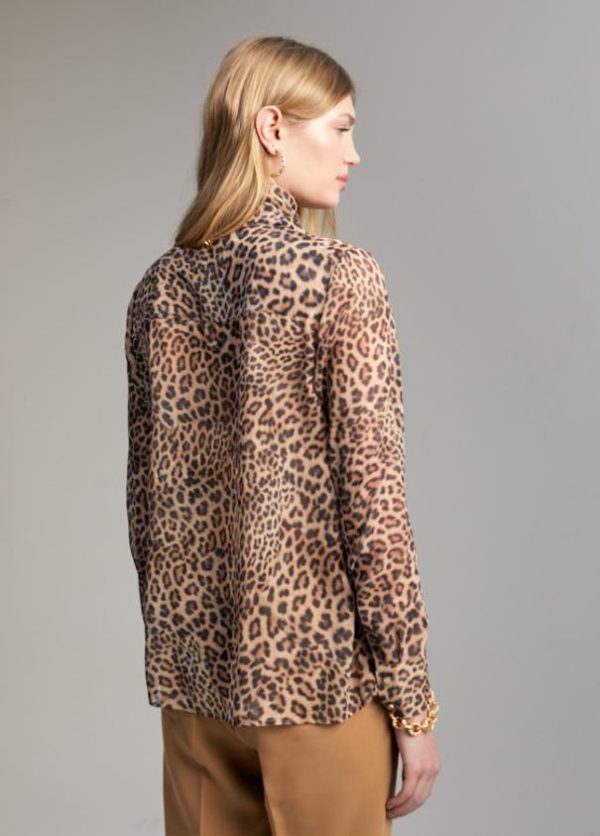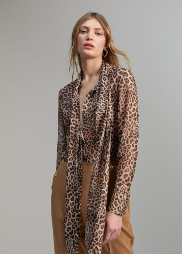 Camisa en estampado animal print. Detalle de lazada en cuello. Cerrada con botones.