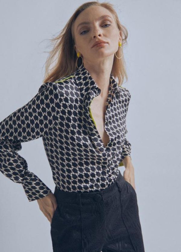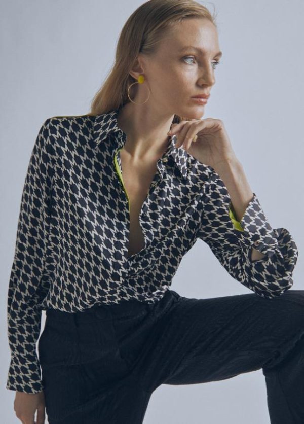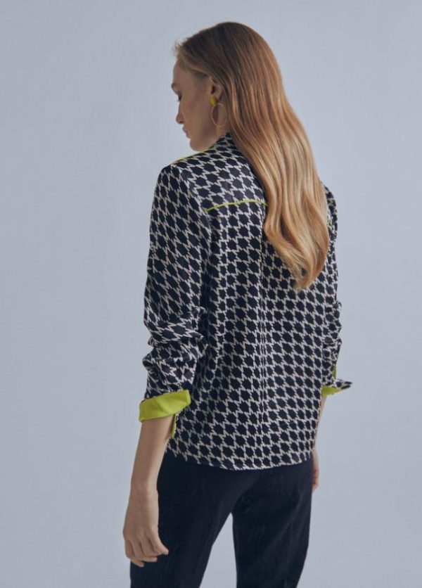 Camisa tejido fluido con estampado M bicolor. Cuello y puños camiseros. Detalles color fluor.