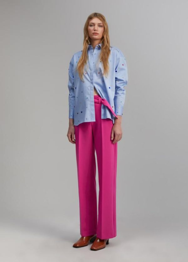 Camisa con detalle joyas multicolor. Cuello y puños camiseros. Cerrada con botones ocultos por tapete. Bajo asimétrico.
