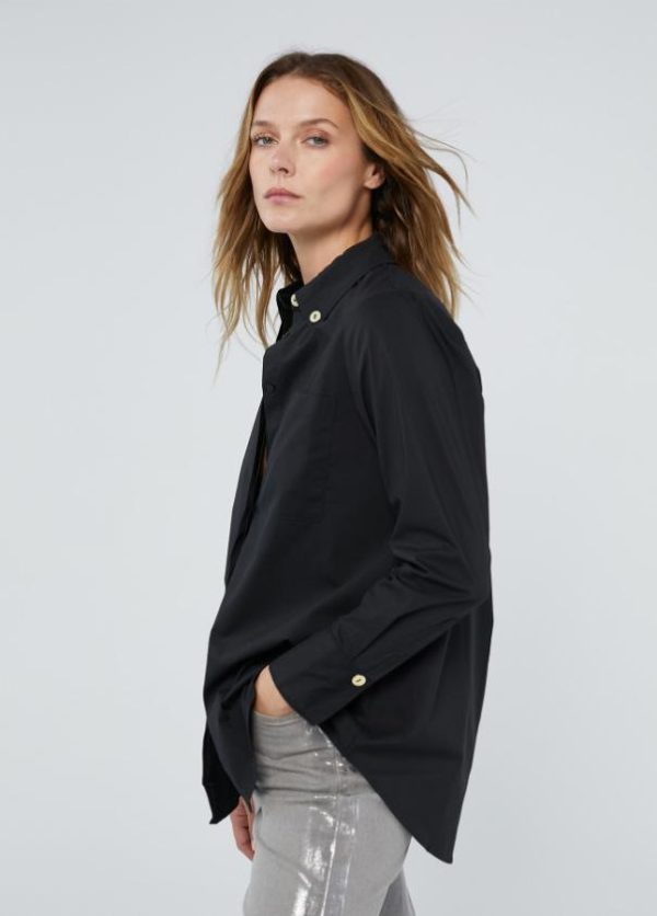 Camisa con botón metálico en cuello. Puños camiseros. Cerrada con botones bajo tapete. Pliegue en espalda con detalle logo a contraste.