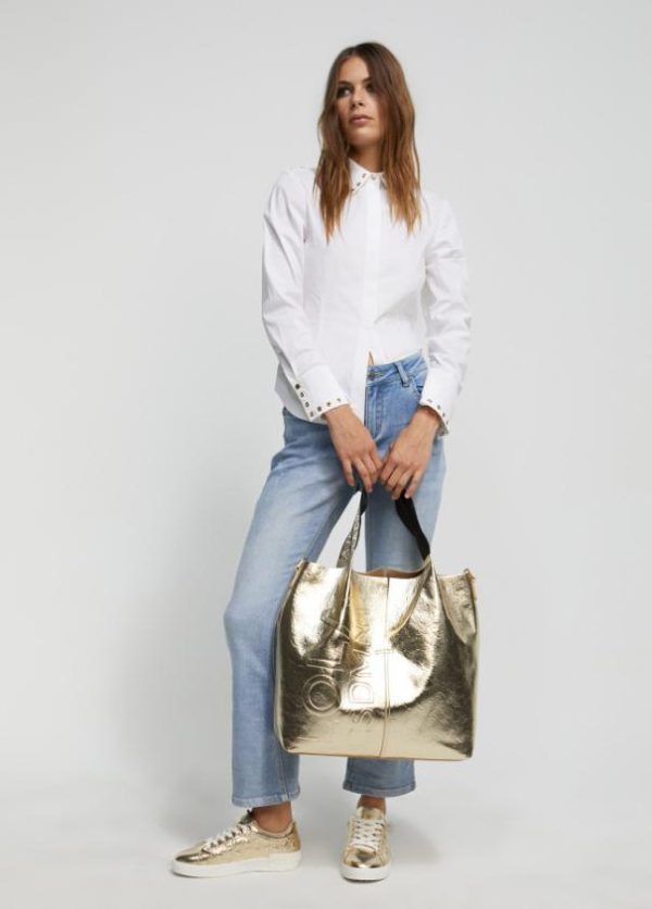 Camisa entallada. Detalle de tachas metálica en cuello y puños camiseros. Cerrada con botones ocultos por tapete.