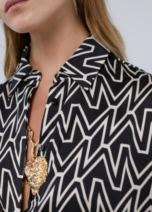 Camisa larga de cuello y puños camiseros. Estampado monograma M bicolor. Cerrada con botones centrales ocultos por tapete.