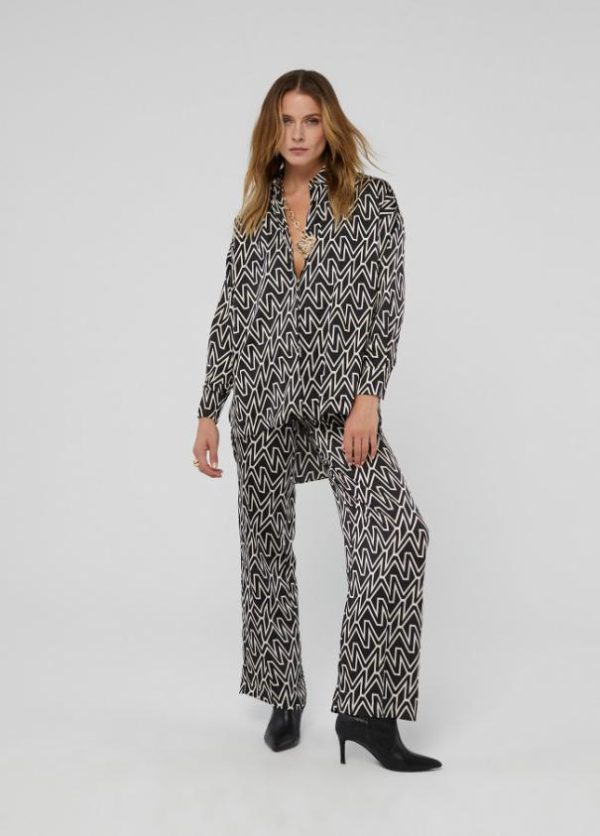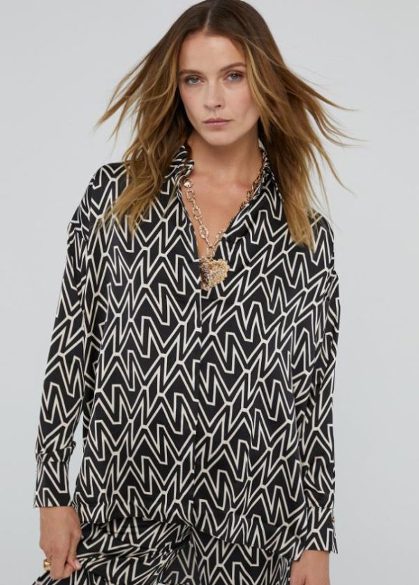 Camisa larga de cuello y puños camiseros. Estampado monograma M bicolor. Cerrada con botones centrales ocultos por tapete.