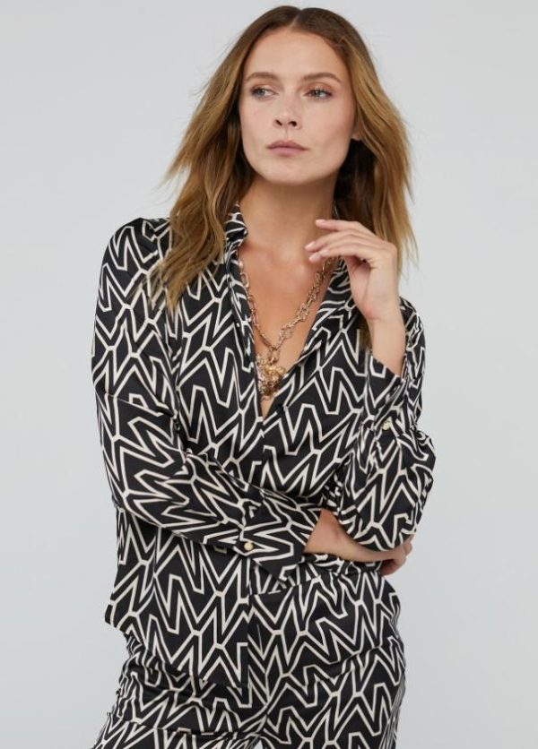 Camisa en estampado bicolor monograma M. Cuello y puños camiseros. Cerrada con botones bajo tapete.