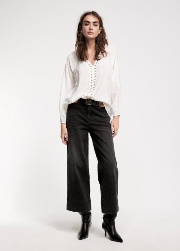 Blusa fluida con escote pico. Detalle de eyelets metálicos en frontal. Mangas ligeramente abollonadas con puños elásticos.