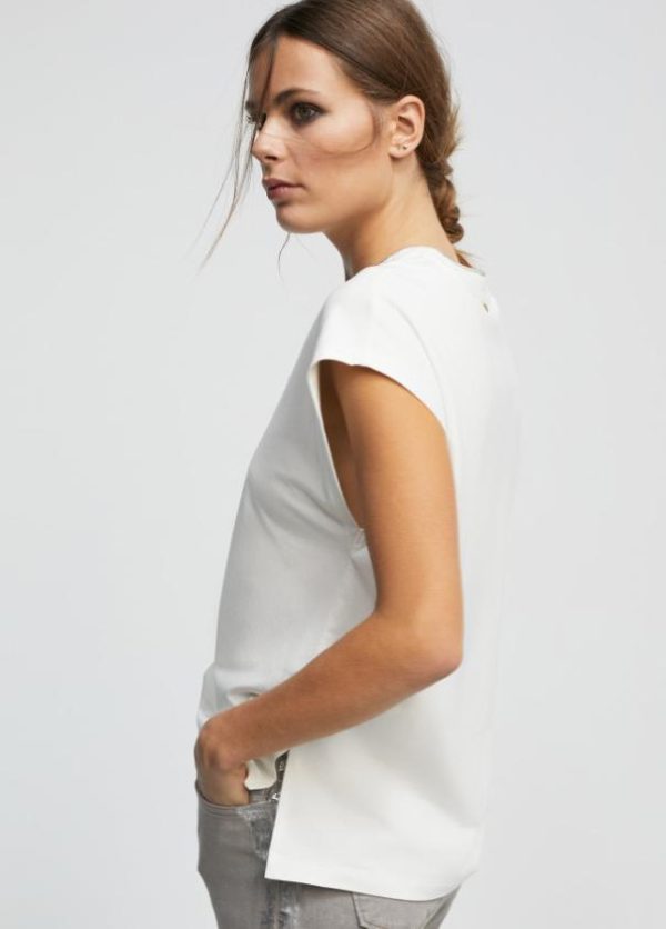 Camiseta en cuello pico y manga sisa. Detalle de cadena mini en cuello.