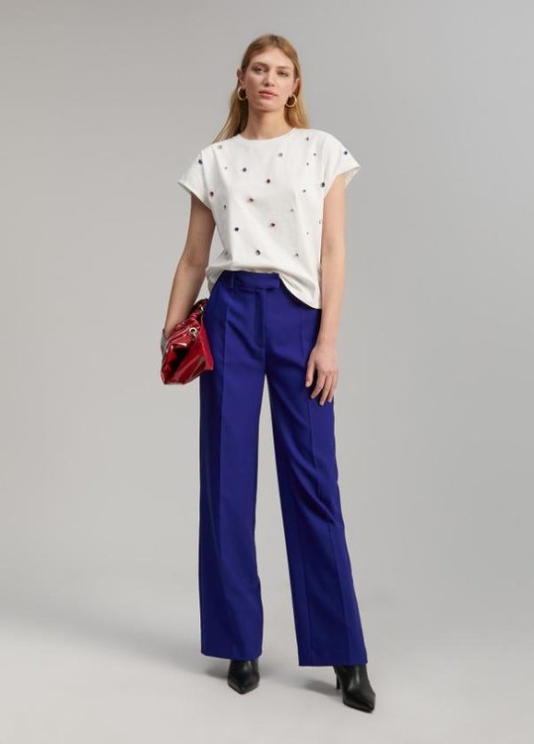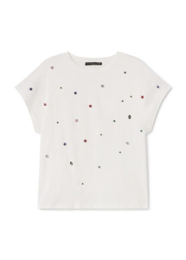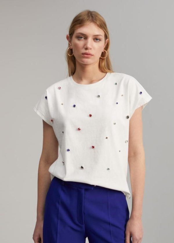 Camiseta recta de manga corta y cuello caja. Detalle de joyas multicolor en frontal.