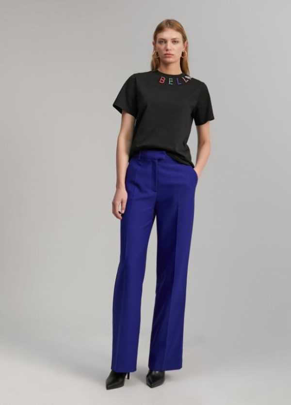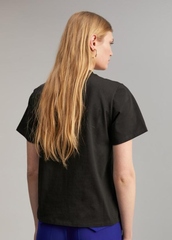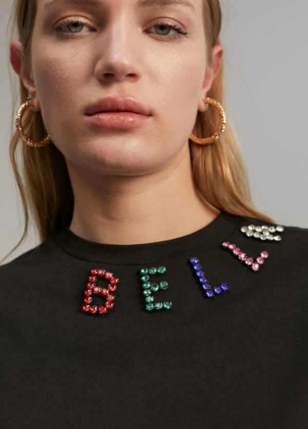 Camiseta de manga corta y cuello caja. Detalle BELLA en pedrería contrastada.