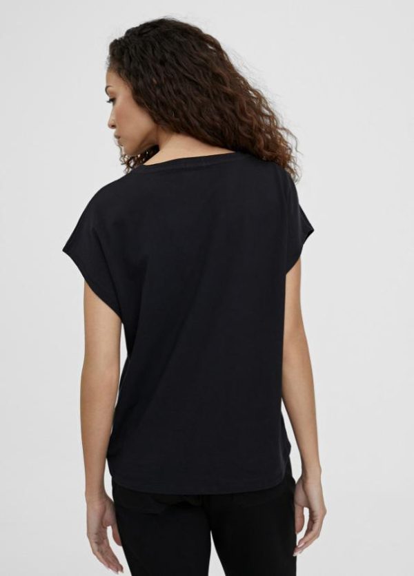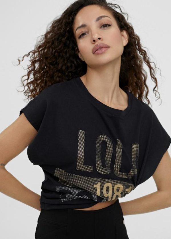 Camiseta de cuello caja y manga semi caída. Posicionado frontal en efecto metal en plateado y dorado .