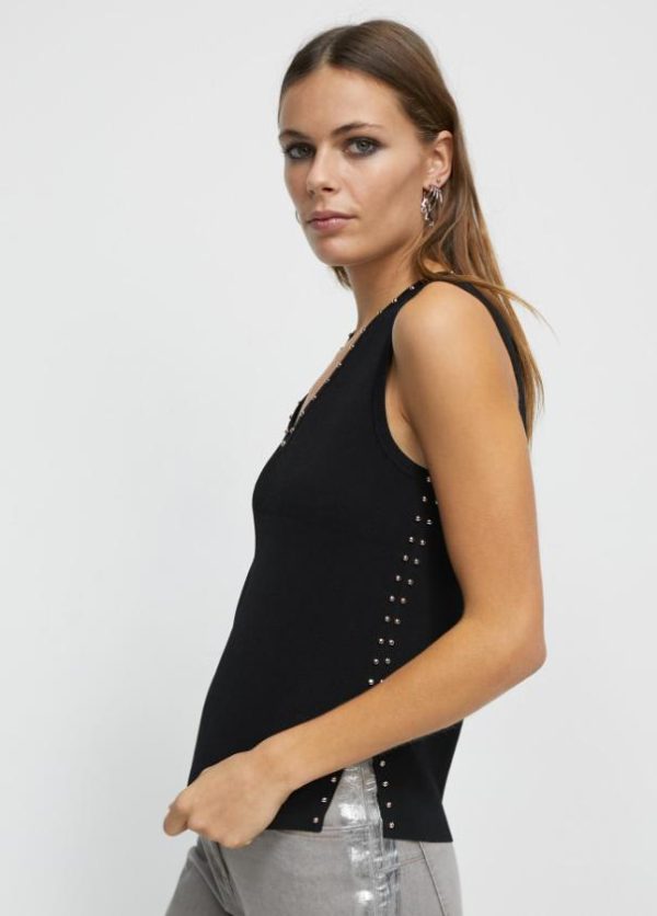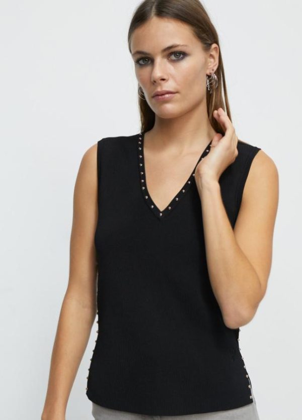 Top de cuello pico y sin mangas. Detalle de tachas doradas en cuello y lateral.