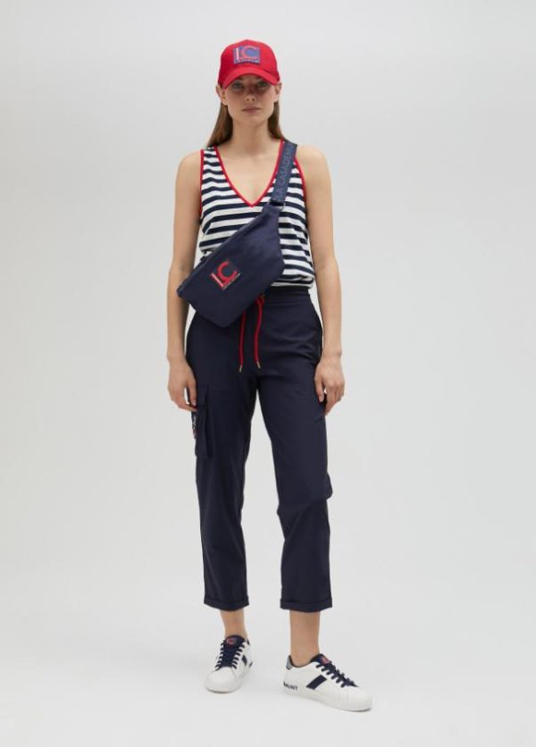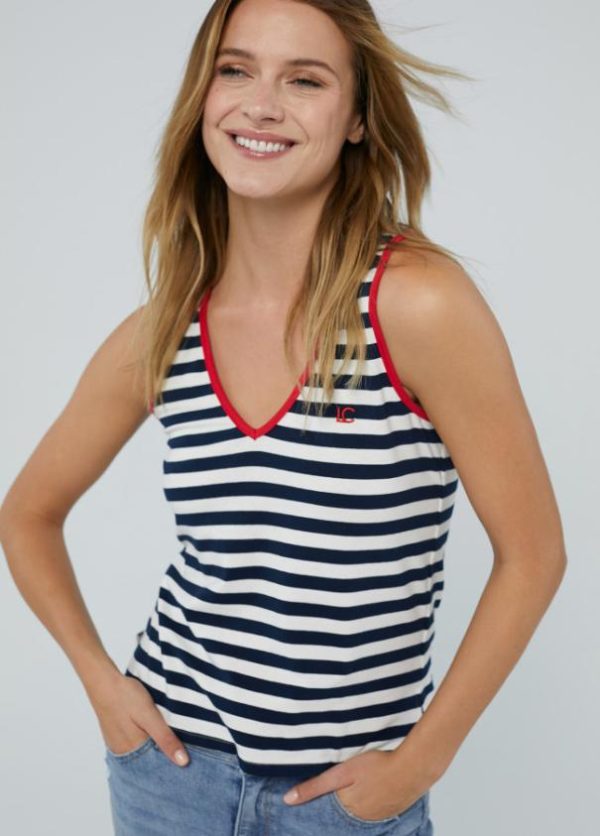 Top estampado de rayas confeccionado en hilatura de algodón 100%. Escote pico pronunciado y tirantes anchos. Detalle de logo bordado a contraste en delantero y espalda. Edición limitada en colaboración con American Magic.
