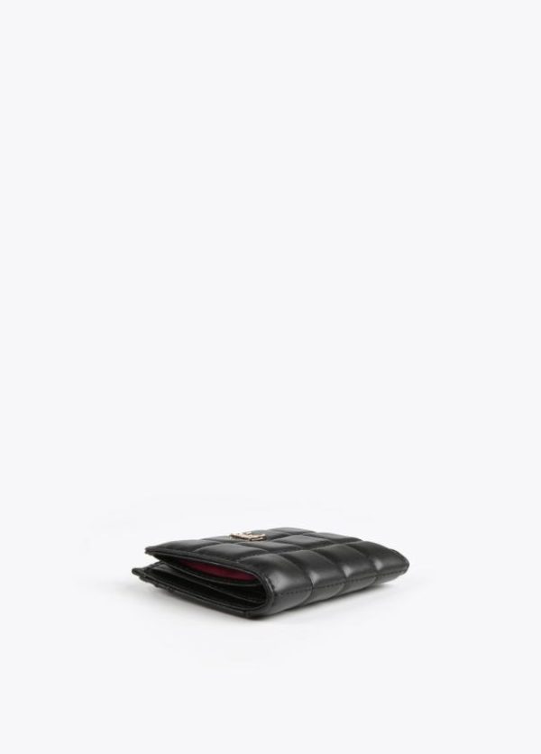 Billetero en efecto piel acolchado con monedero con cierre de cremallera y cierre central con botón clic. Logo dorado con cristales en parte frontal.