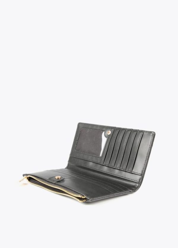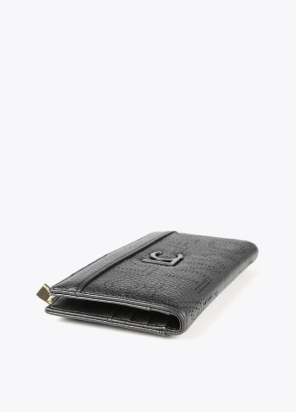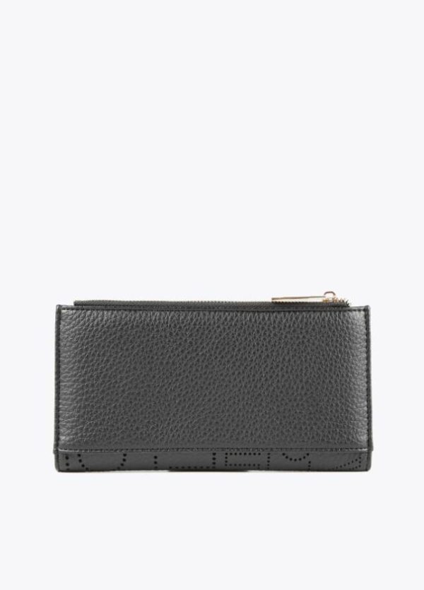 Billetero grande con logotipo troquelado. Cierre con cremallera en monedero y cierre con botón clic en zona tarjetero.
