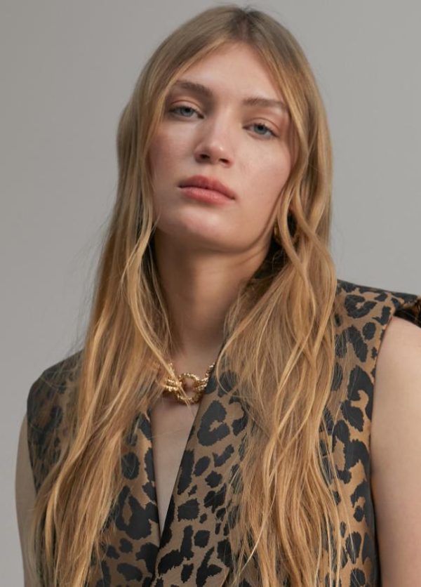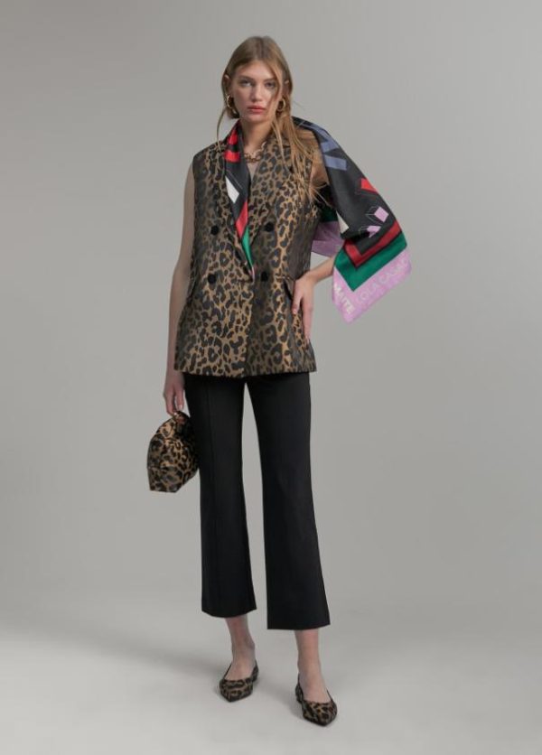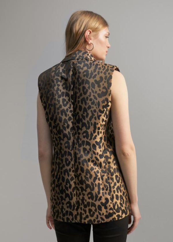 Chaleco recto en estampado animal print. Cuello solapa y hombreras. Botones centrales y tapetes laterales.