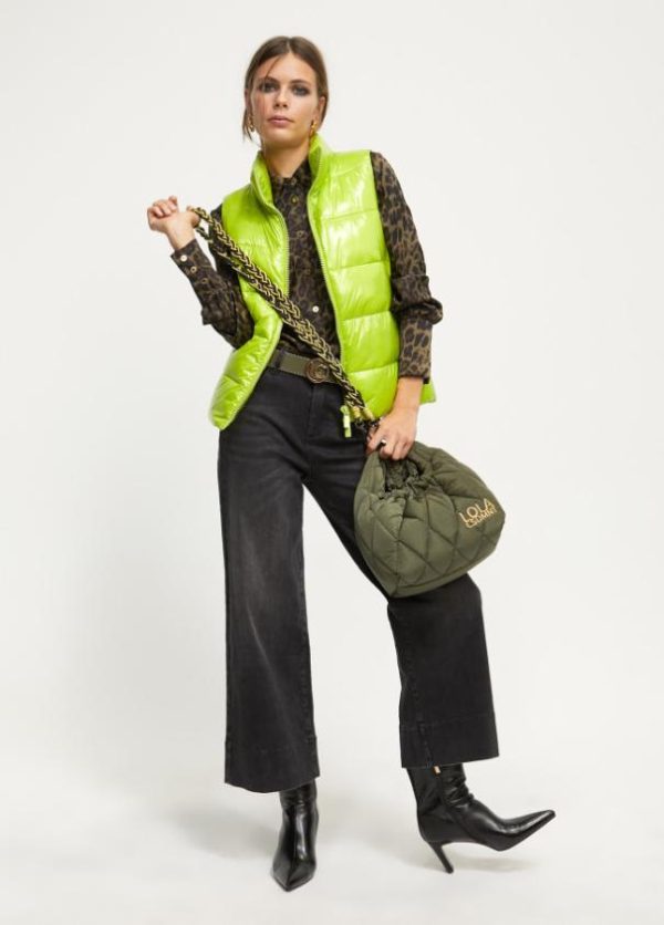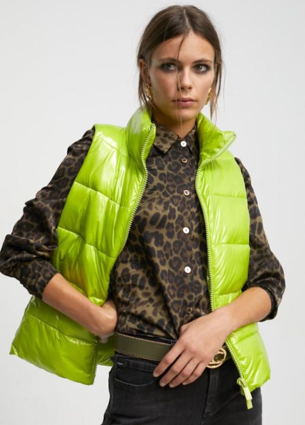 Chaleco corto acolchado en efecto charol. Cierre con cremallera de doble carro a tono. Bolsillos laterales y logo en espalda.
