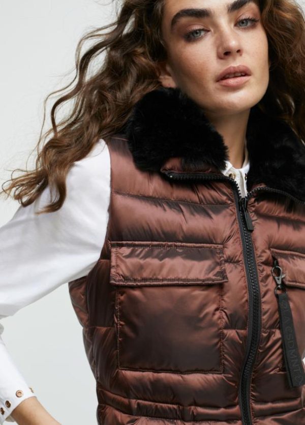 Chaleco acolchado efecto metalizado. Cuello de pelo. Bolsillos superiores tipo plastrón con tapete. Bolsillos laterales cerrados con cremallera. Cintura ajustable. Cierre con cremallera de doble carro.