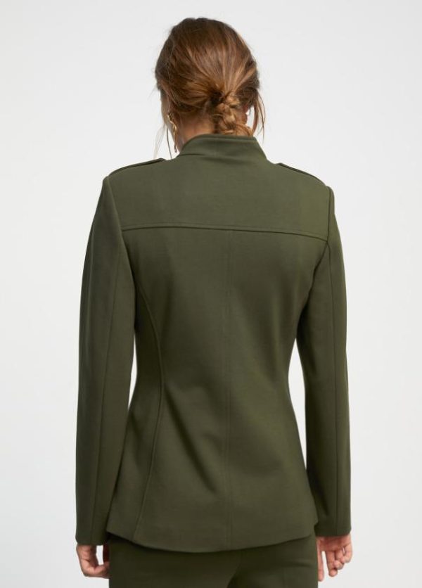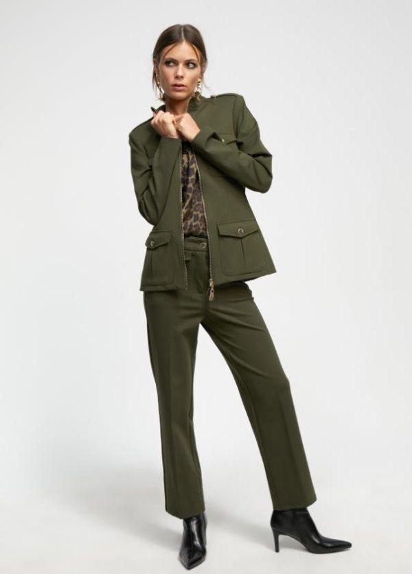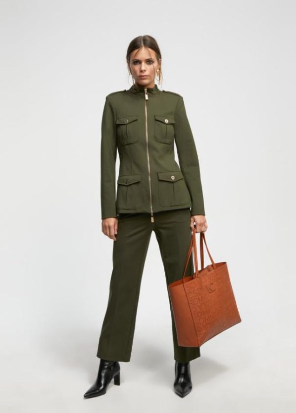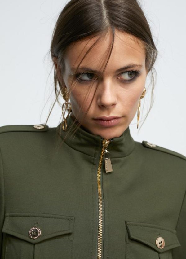 Chaqueta de punto roma cerrada con cremallera dorada. Bolsillos frontales tipo plastrón con tapete y botón. Trabilla con botón metálico en hombros.
