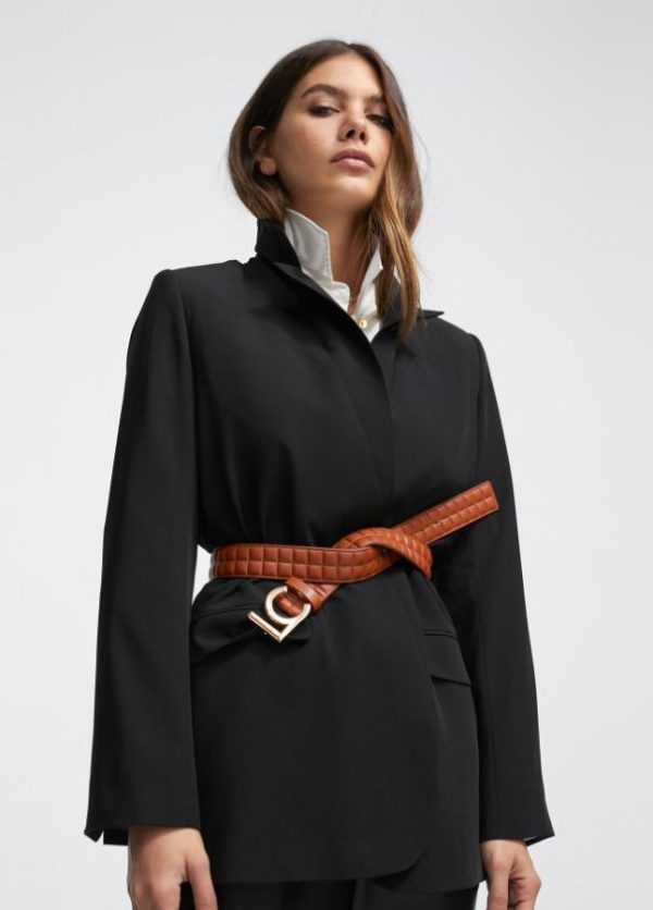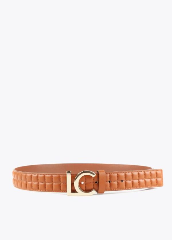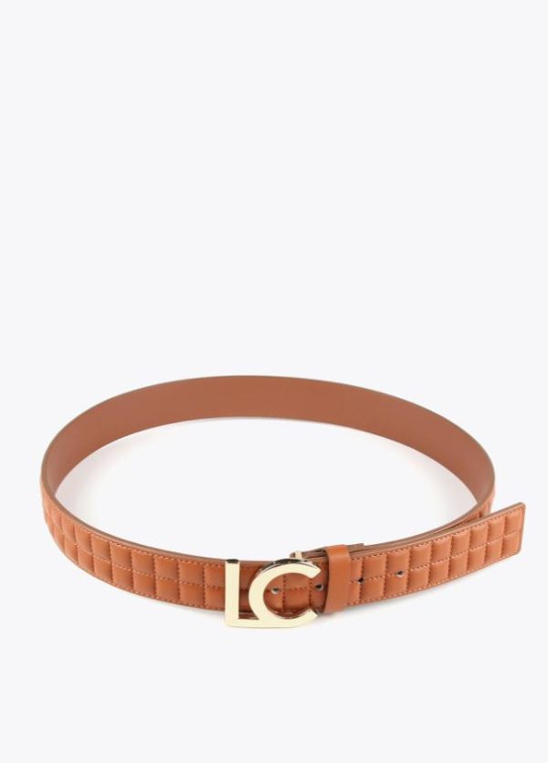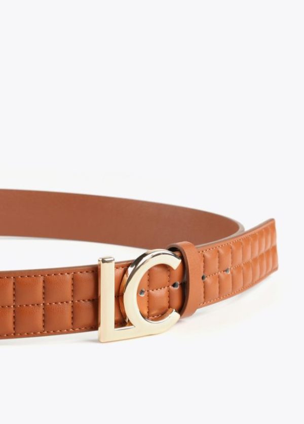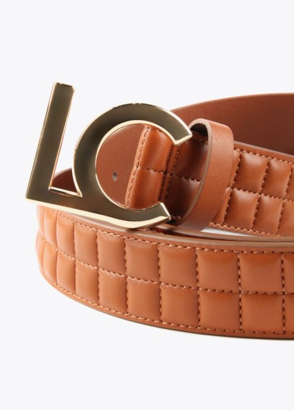 Cinturón efecto piel estilo acolchado con letras logo doradas a modo de hebilla.
