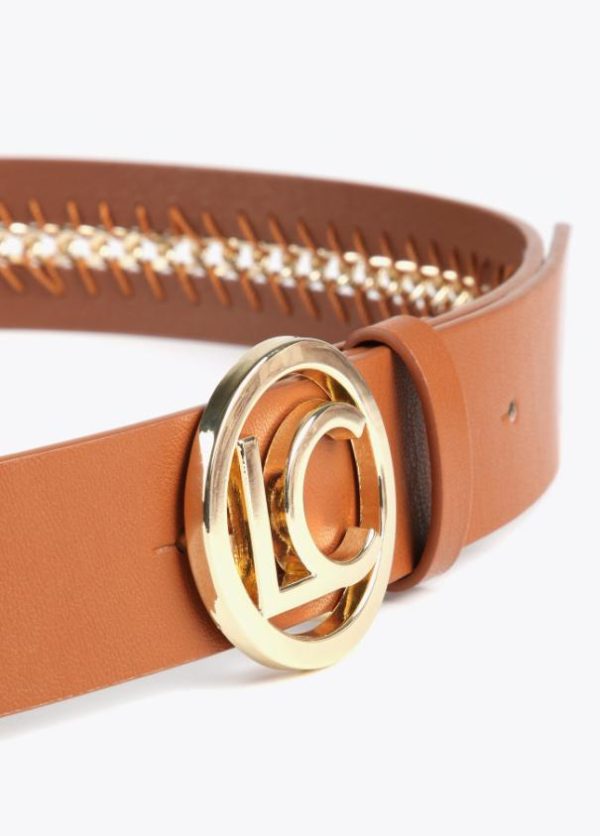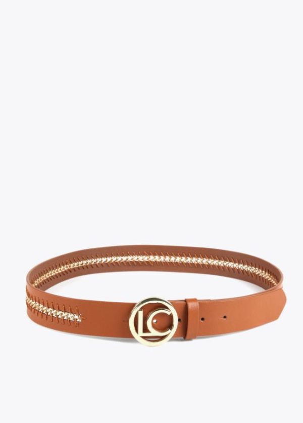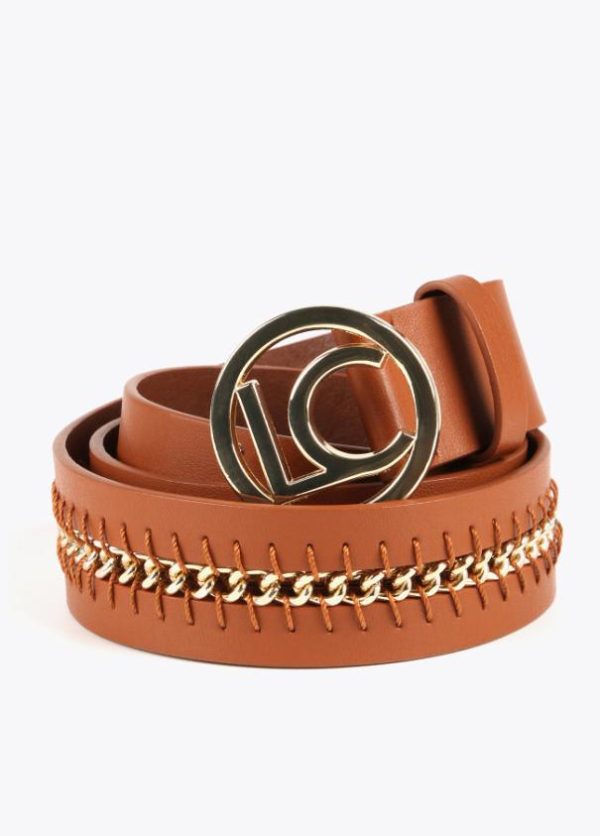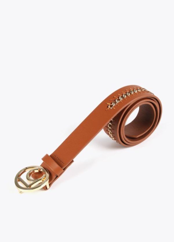 Cinturón en efecto piel con cadena dorada en zona central y letras logo a modo de hebilla.