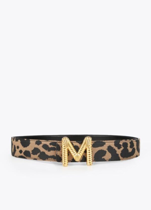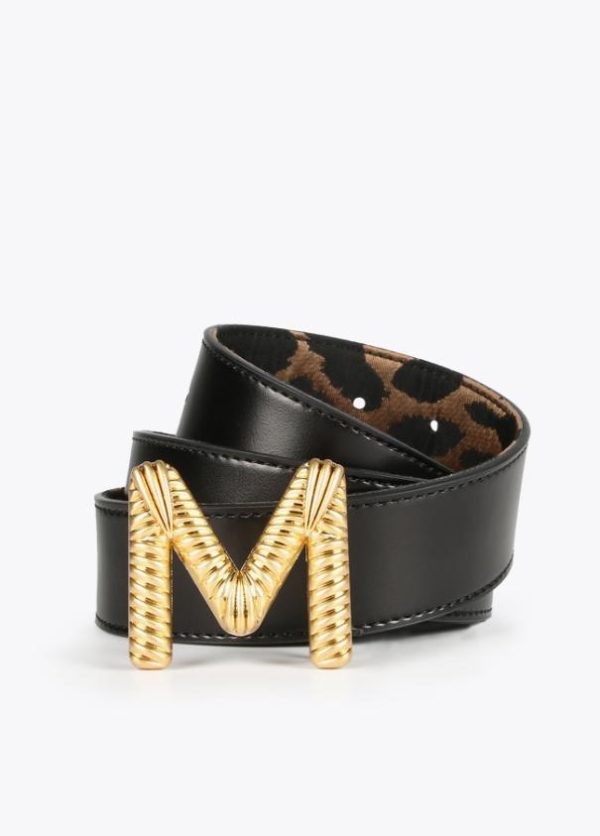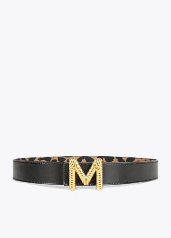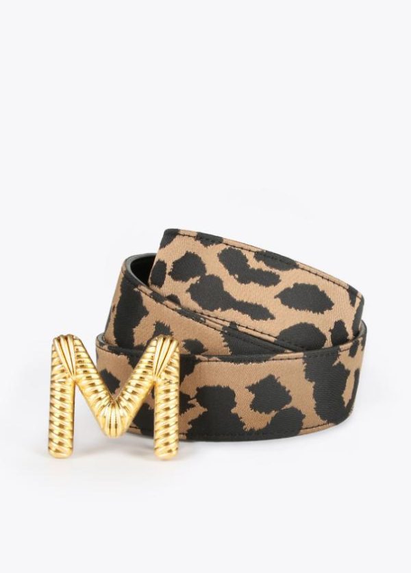 Cinturón reversible en estampado animal con interior contrastado en negro. Hebilla dorada metalizada en forma de logo.