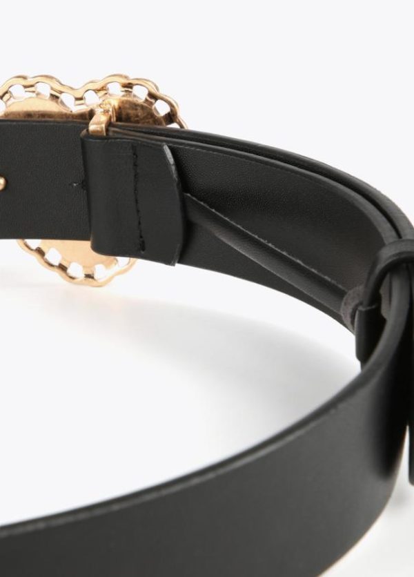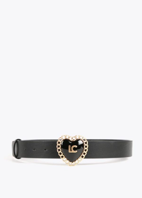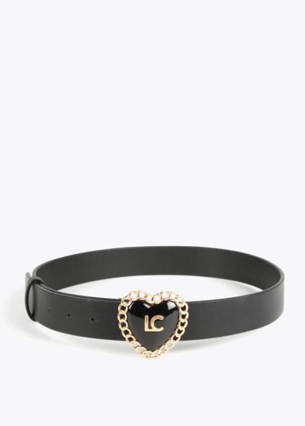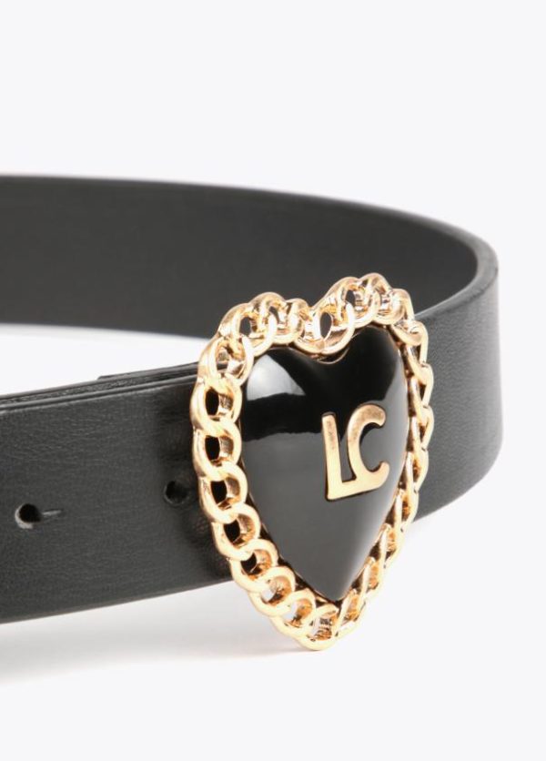 Cinturón en efecto piel negro con hebilla corazón encadenado y letras logo doradas.