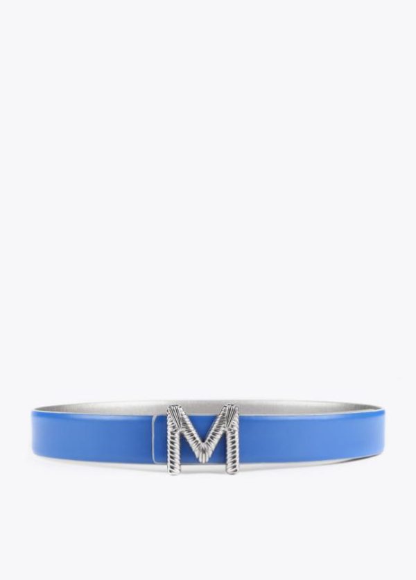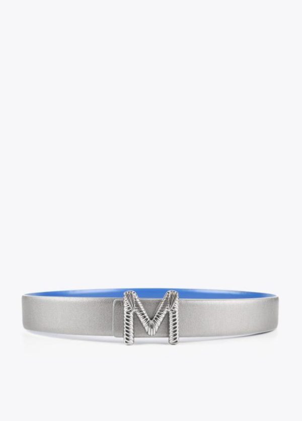 Cinturón reversible con letra logo dorada a modo de hebilla.