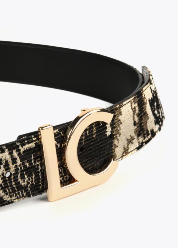 Cinturón reversible en tejido jaqcuard con interior contrastado en negro. Hebilla metalizada en forma de logo.