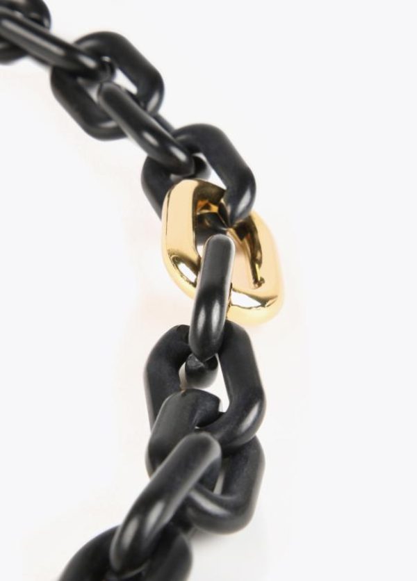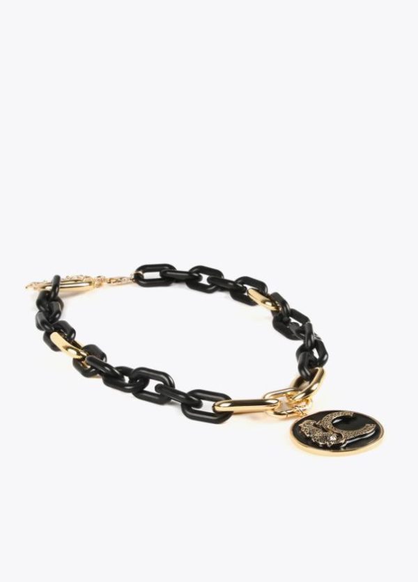Collar tipo gargantilla de cadena negra con detalles dorados y medallón logo animal.