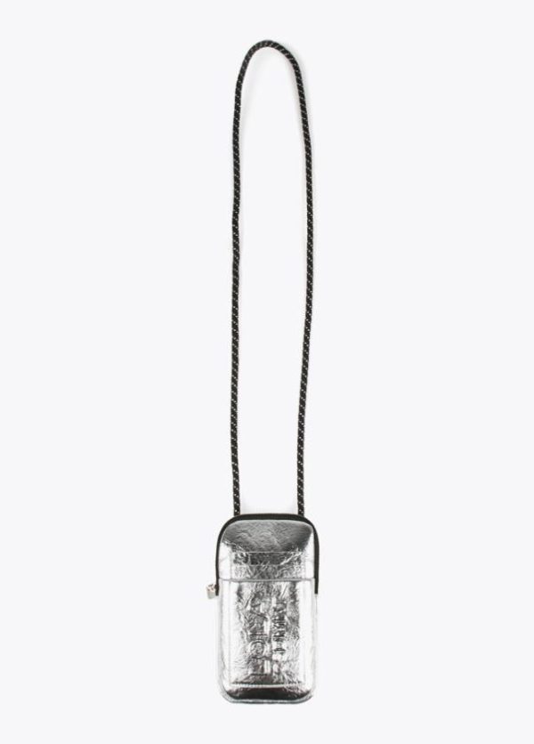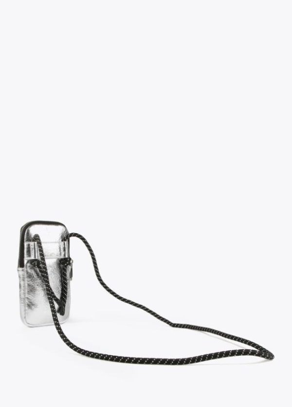 Bolsito porta móvil metalizado con logo grabado en relieve y cierre de cremallera. Asa bandolera de cordón ajustable.