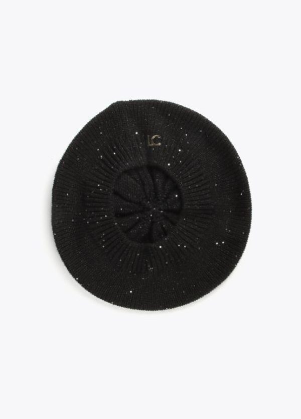 Boina en color negro con micro lentejuelas. Detalle letras logo doradas.