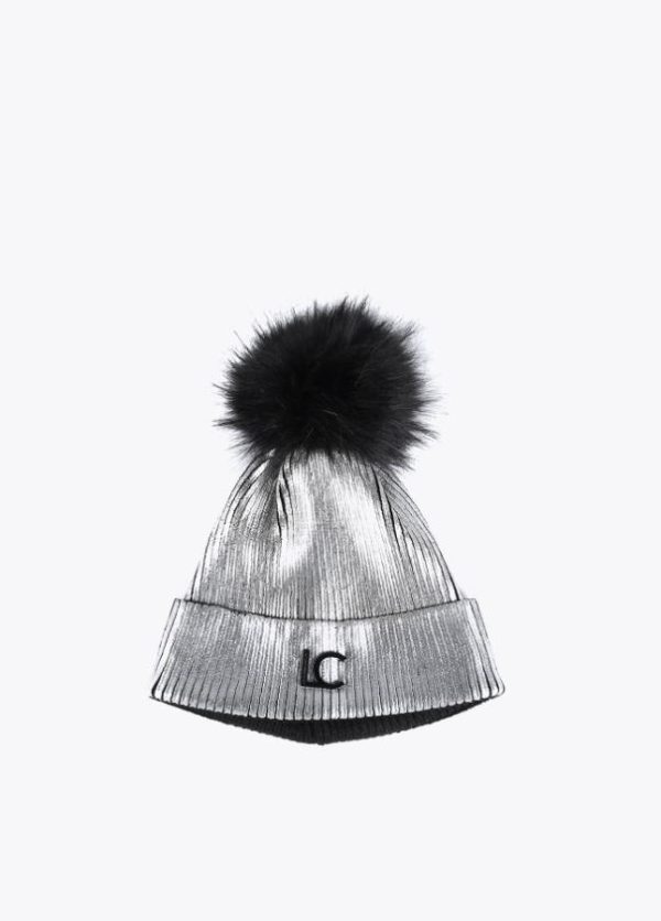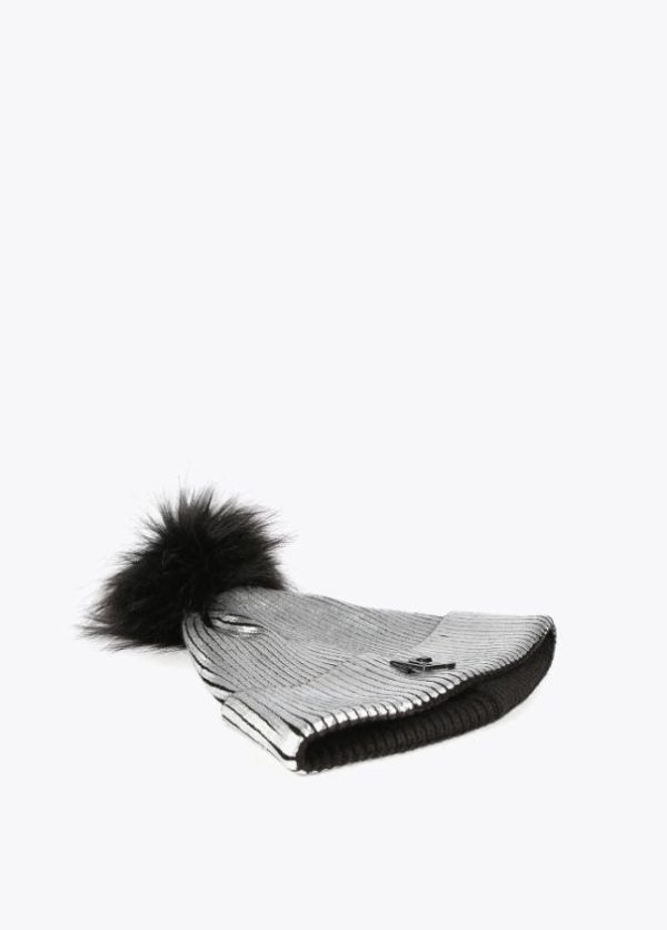Gorro de tricot platerado con maxi pompón efecto pelo y letras logo lacadas en parte frontal.