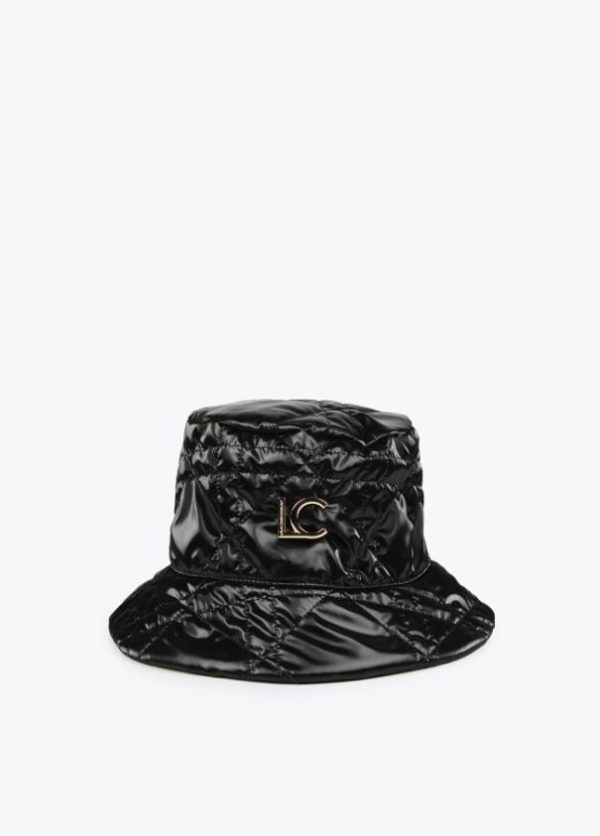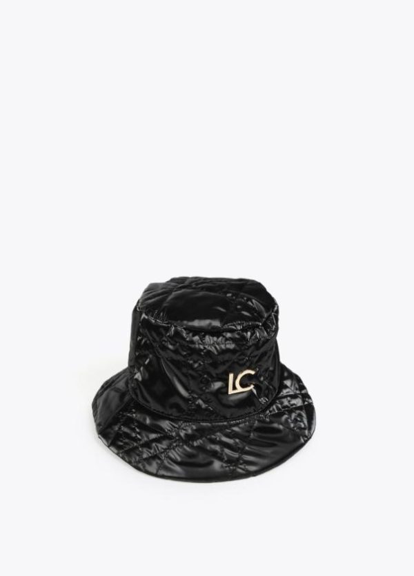 Gorro tipo bucket acolchado en nylon brillante y logo dorado en parte frontal.