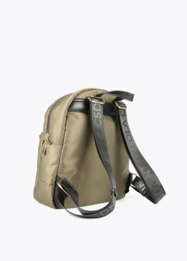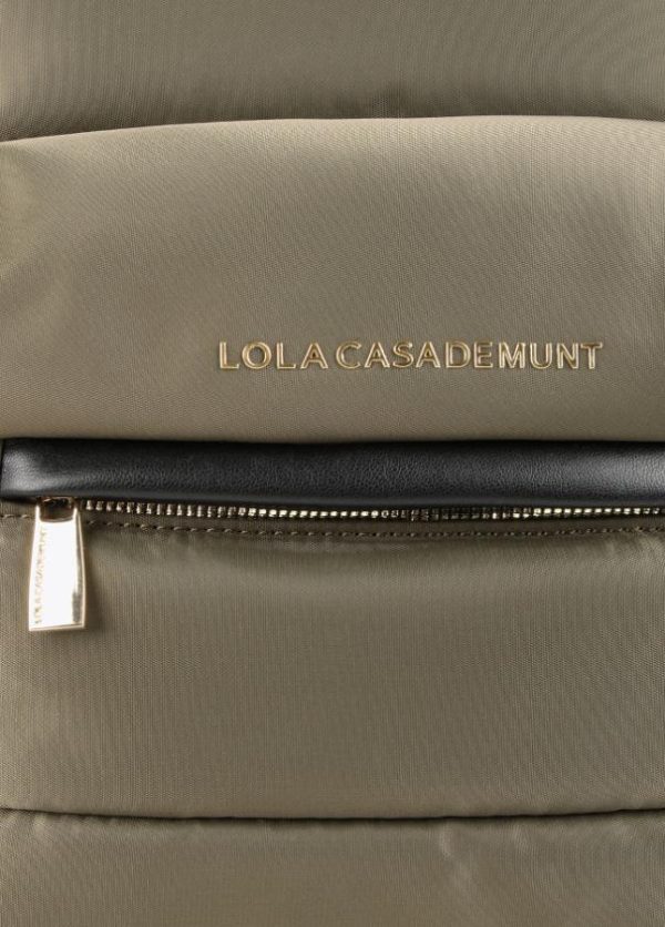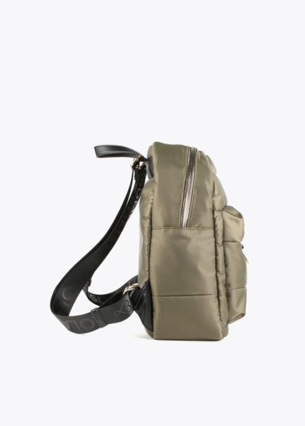 Mochila acolchada de nylon con logo dorado en parte frontal. Bolsillo con cremallera en compartimento frontal y asa de mano y asas de espalda ajustables.