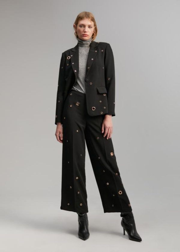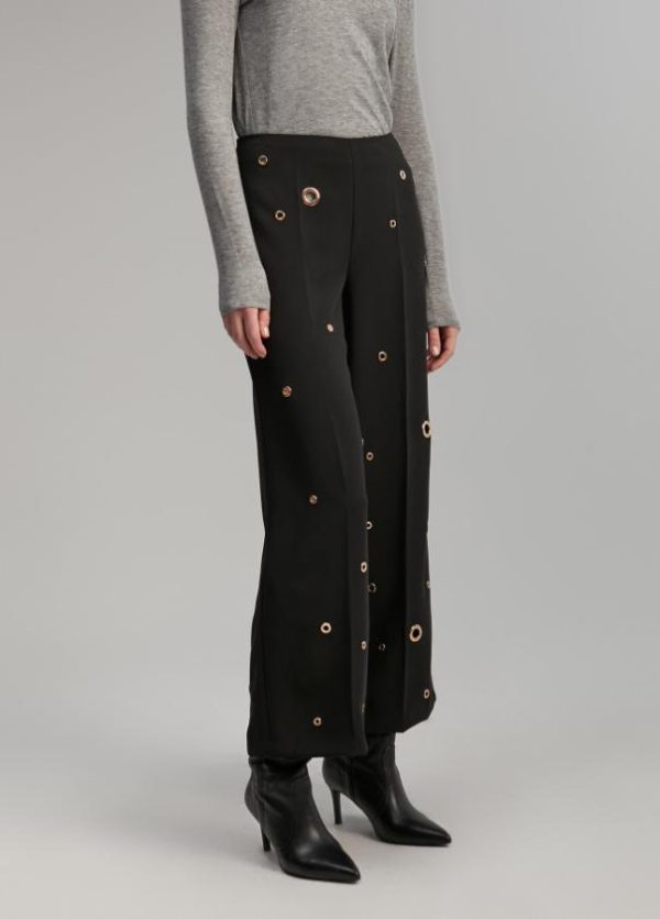 Pantalón de pierna ancha y de largo tobillero. Detalle eyelets en metal dorado. Cerrado con cremallera frontal y ganchos metal interiores. Falso bolsillo de vivo en espalda.