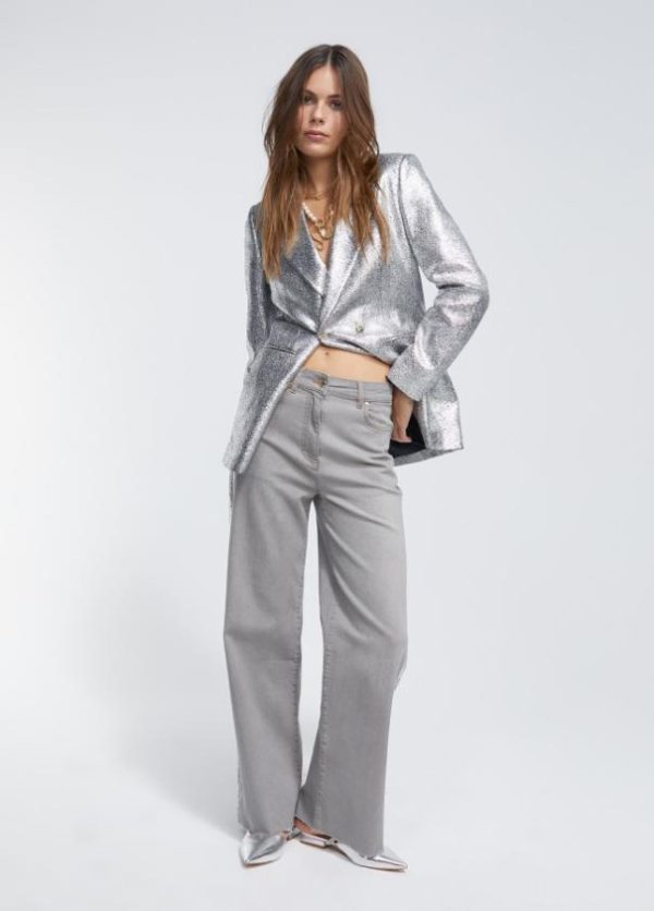 Pantalón tejano de tiro alto y pierna ancha. Cerrado con cremallera frontal. Bolsillos delanteros y traseros tipo plastrón. Detalle de banda laminada plateada en lateral perneras.