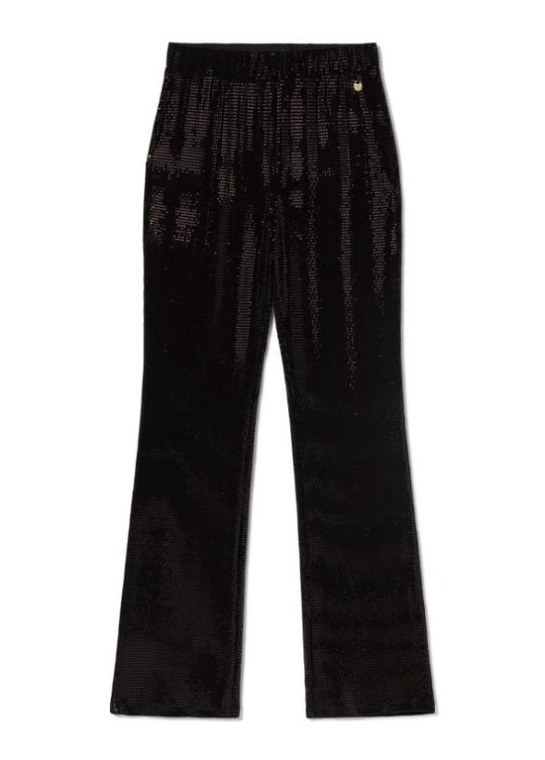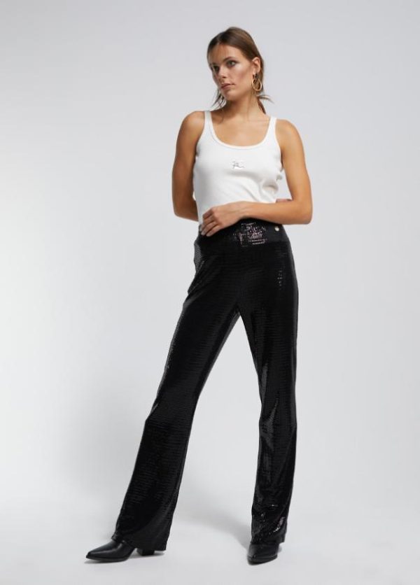 Pantalón negro en punta de efecto lentejuela. Cintura de tiro alto ajustable. Pernera recta. Detalle de colgante logotipado en lateral.