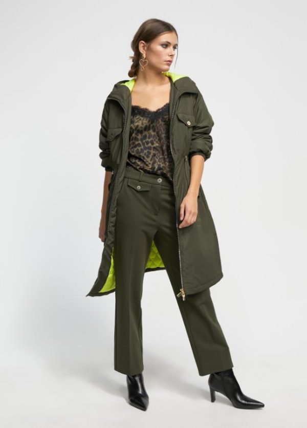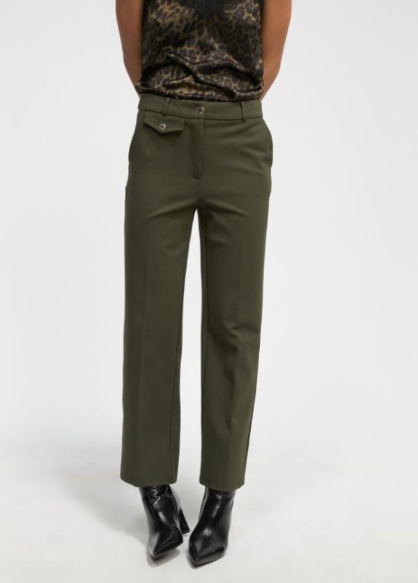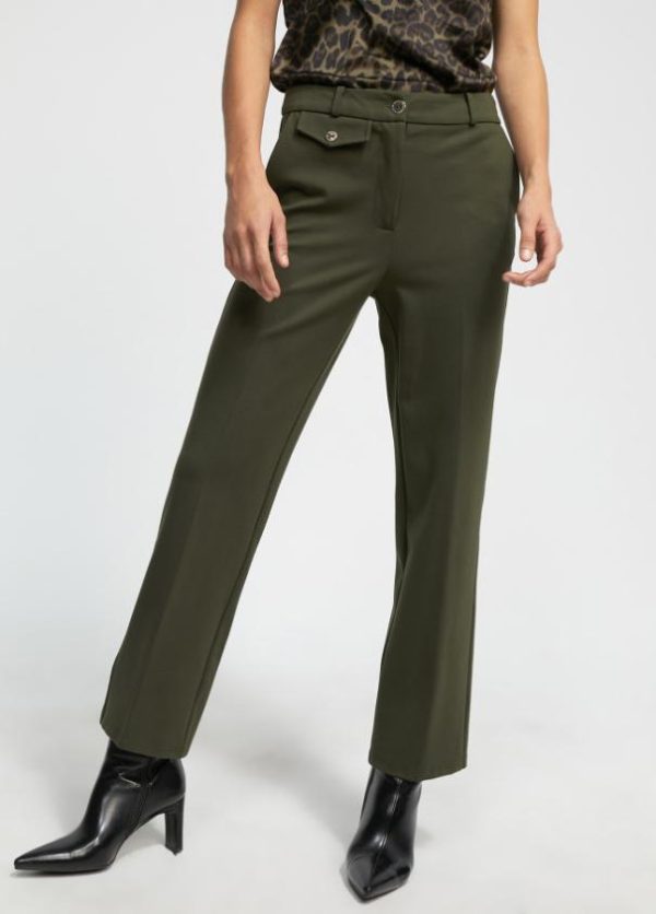 Pantalón recto en punto roma. Detalle tapete frontal con botón. Bolsillos laterales y bolsillo tipo vivo en parte trasera.