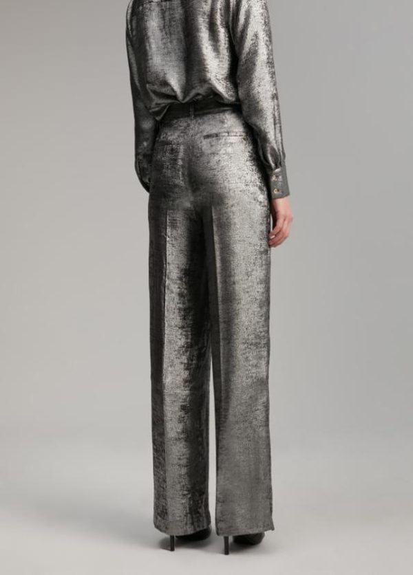 Pantalón recto efecto laminado. Cerrado con cremallera frontal y ganchos metálicos interiores. Trabillas en cintura y bolsillos laterales. Falso bolsillo tipo vivo en espalda.