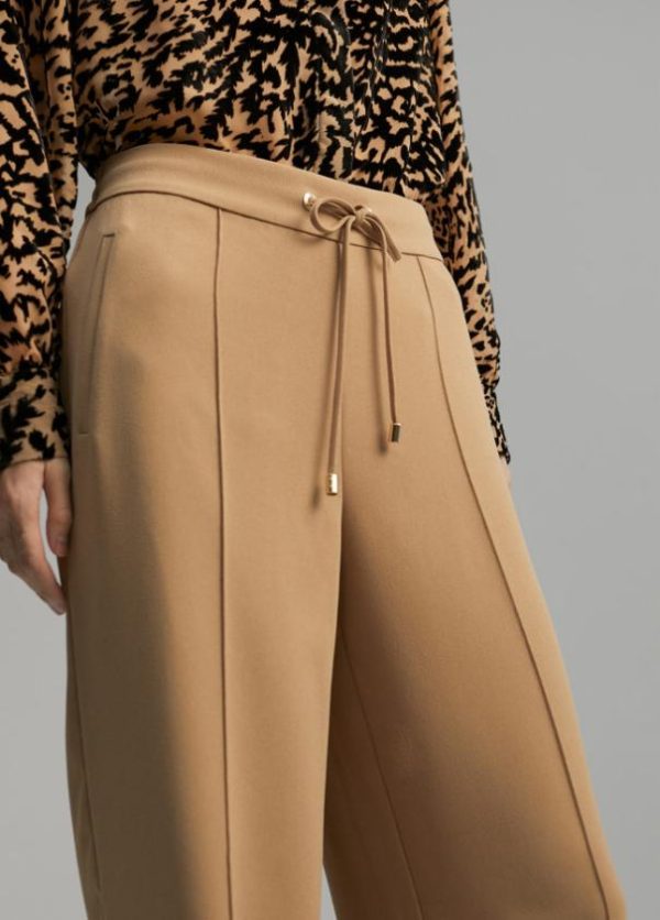 Pantalón wideleg de pernera ancha y cintura elástica ajustable con cordones. Pinzas delanteras y falso bolsillo vivo en espalda.